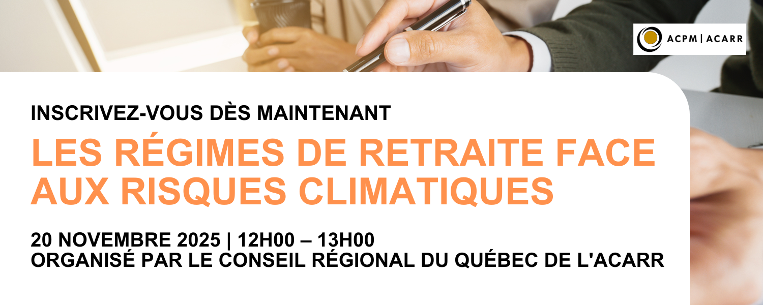 C’est pourquoi le Conseil régional du Québec de l’ACARR est heureux d’accueillir, en novembre prochain, Alain Webster, professeur titulaire au Département d’économique et au Centre universitaire de formation en environnement et développement durable de l’Université de Sherbrooke, pour une conférence incontournable sur les risques climatiques et leurs effets potentiels sur les régimes de retraite au Canada.