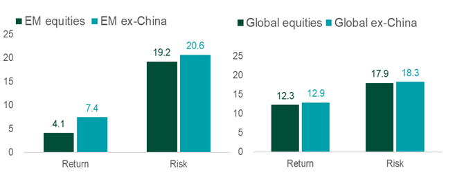 - At the global level, the differences are less pronounced. The MSCI ACWI IMI Index returned 12.3% annually over the past five years with a risk level of 17.9%. Removing China increased the return by 0.6% and risk by 0.4%.