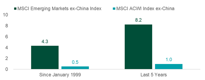 The question of tracking error can be front-of-mind for investors when it comes to managing risk from China equities. Exhibit 3 shows the tracking error of the MSCI Emerging Markets ex-China Index against the broader MSCI Emerging Markets Index, since 1999 and over the last five years.