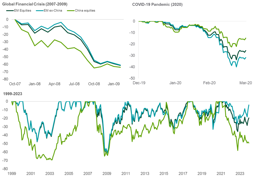The top charts of Exhibit 4 highlight the performance of Chinese equities and emerging markets equities, both with and without China, during arguably the two most prolific stress periods of the recent past — the Global Financial Crisis and the COVID-19 pandemic.