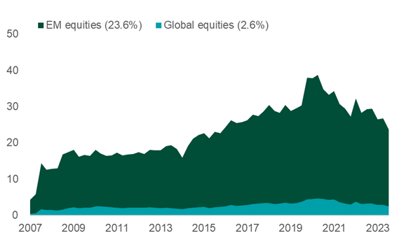 China has risen to represent 24% of the MSCI Emerging Markets Index, but it is only 3% of the MSCI ACWI IMI Index.