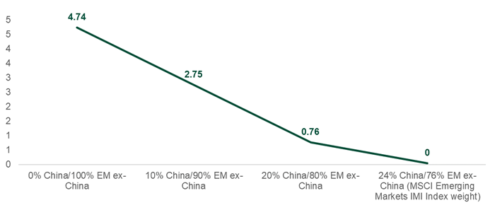 In contrast, fully excluding China results in an expected active risk of 4.74%, which may not be palatable for benchmark-aware, risk conscious investors. A more modest approach of adjusting the weight of China to, say, 10%, would result in an expected active risk of 2.75%, which may be more acceptable.