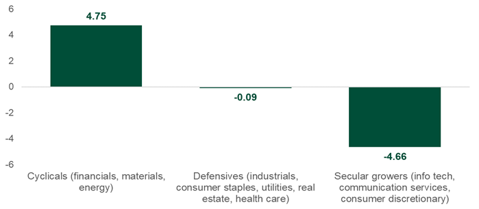Removing China makes the index more sensitive to cyclical sectors (financials, materials and energy) and less sensitive to secular growers, where decreases to the consumer discretionary (-6.3%) and communication services (-3.9%) sectors offset an increase to the information technology (+5.6%) sector.