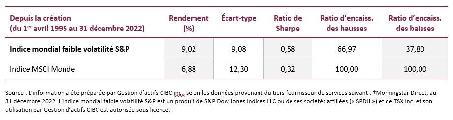 À long terme, les portefeuilles à faible volatilité surpassent le marché sur le plan du rendement corrigé du risque, avec moins de volatilité, tout en offrant une protection en cas de baisse.