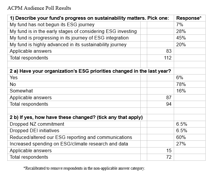 During the panel, over 100 asset owners, fund managers, and consultants were polled about their funds’ progress on environmental, social and governance (ESG) matters and how their priorities evolved over the year.